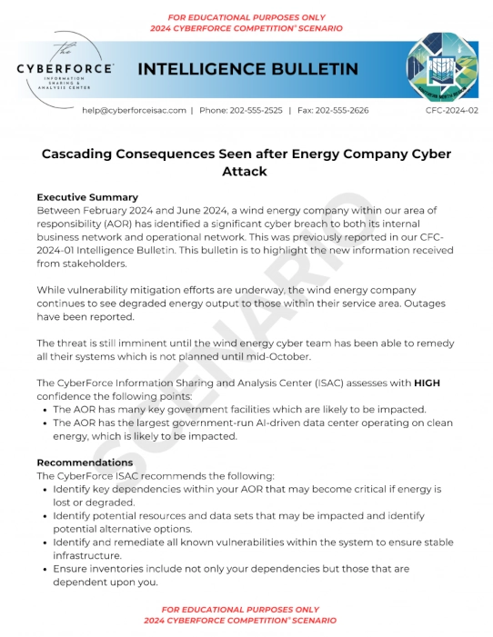 We spent a significant amount of time reading the rules and official messaging in an attempt to determine how we should prepare for the scenario. Critical information about competition content (outside of things like rules) is presented in an in-universe format - teams resolve a cyber incident by reading the bulletin, examining the environment, and devising a response. Our plan was first created from investigation findings and then documented, presented for a C-suite target audience, and enacted during competition day.
