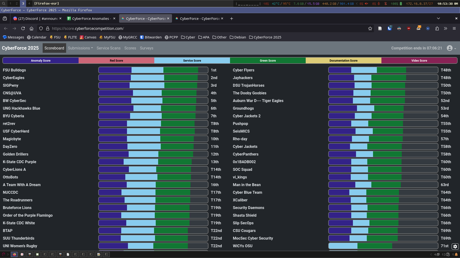 Competition day was hectic, fun, and exhausting at the same time. The red team wouldn’t become active until later, so we began by getting to work immediately on the CTF challenges with monitoring for our systems and services pulled up in the background. Our team nearly earned full points for service integrity and availability due to the strength of our prepared controls and defenses. Assume breached infrastructure (noncritical machines with built-in backdoors for competition purposes), however, became harder to defend to over time. Half of our team would eventually need to pivot towards responding to breach activity before the competition ended, so most of our missed points were the result of challenges with balancing CTF problems against responding to the red team.