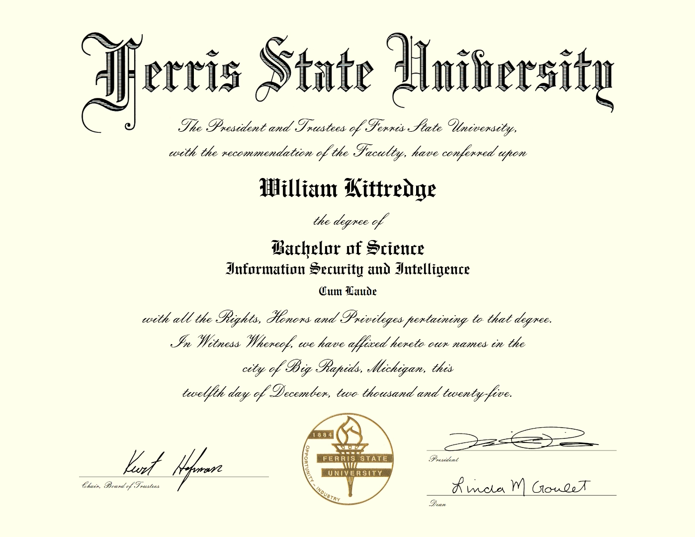 I graduated from Ferris State University in late 2025 with a Bachelor of Science in Information Security and Intelligence.