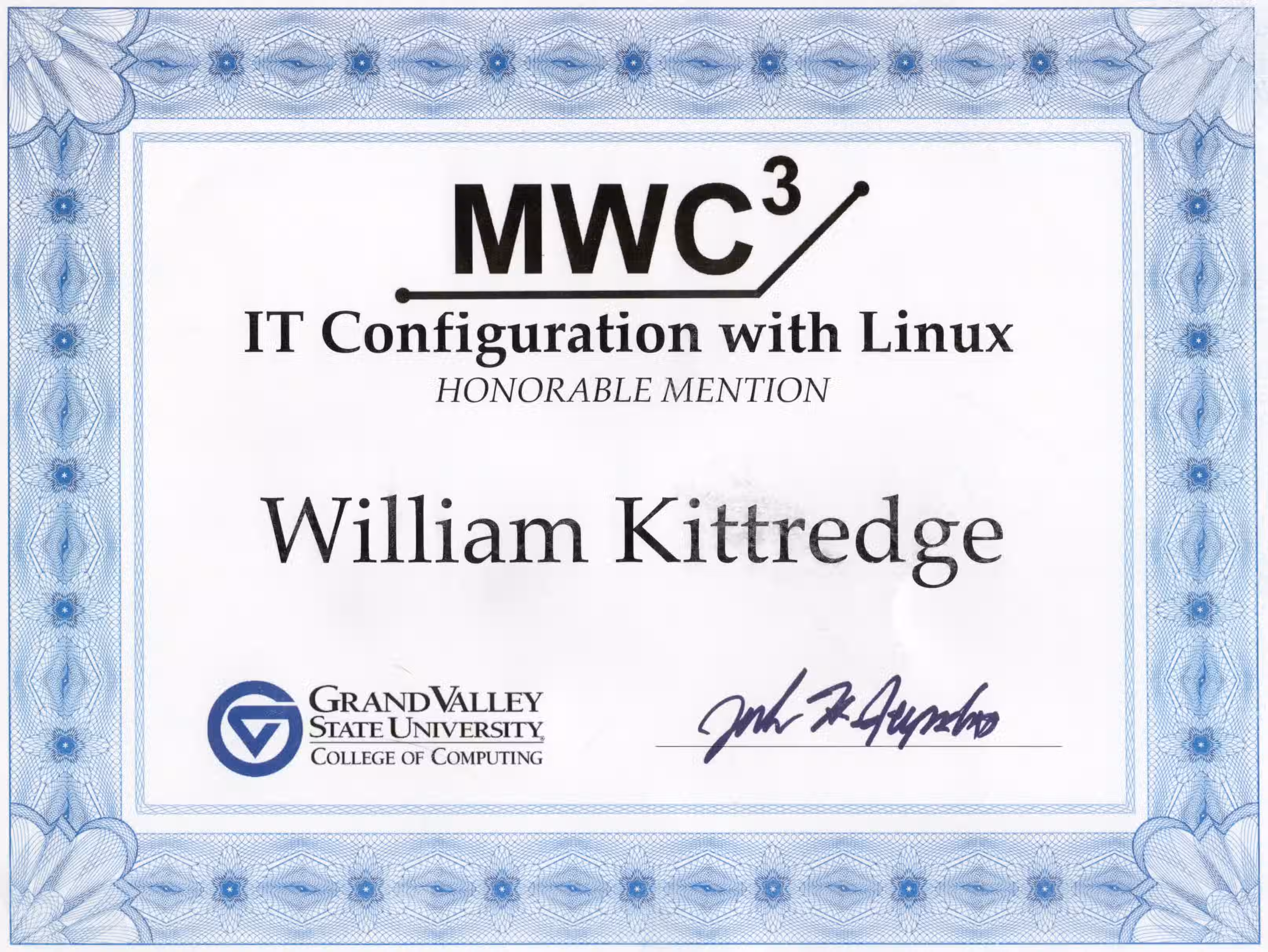 The Midwest Collegiate Computing Conference (MWC3) is a two-day event hosted by Grand Valley State University. It aims to provide collegiate-level students with learning and networking opportunities through workshops and competitions. I attended twice with peers from Ferris State University and earned four awards.